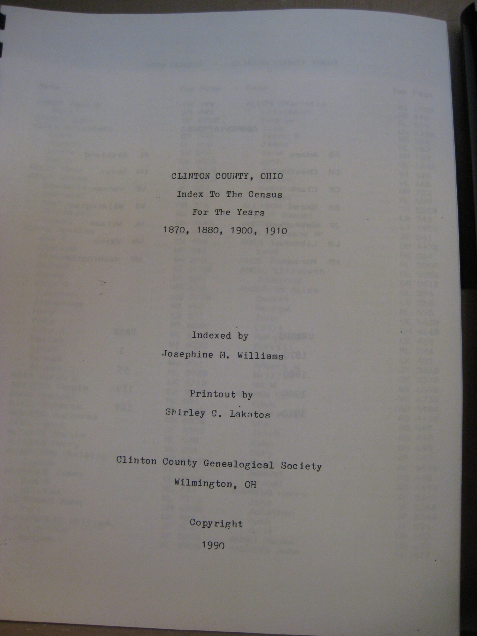 Book: Census Index, Clinton Co., OH – 1870, 1880, 1900 & 1910