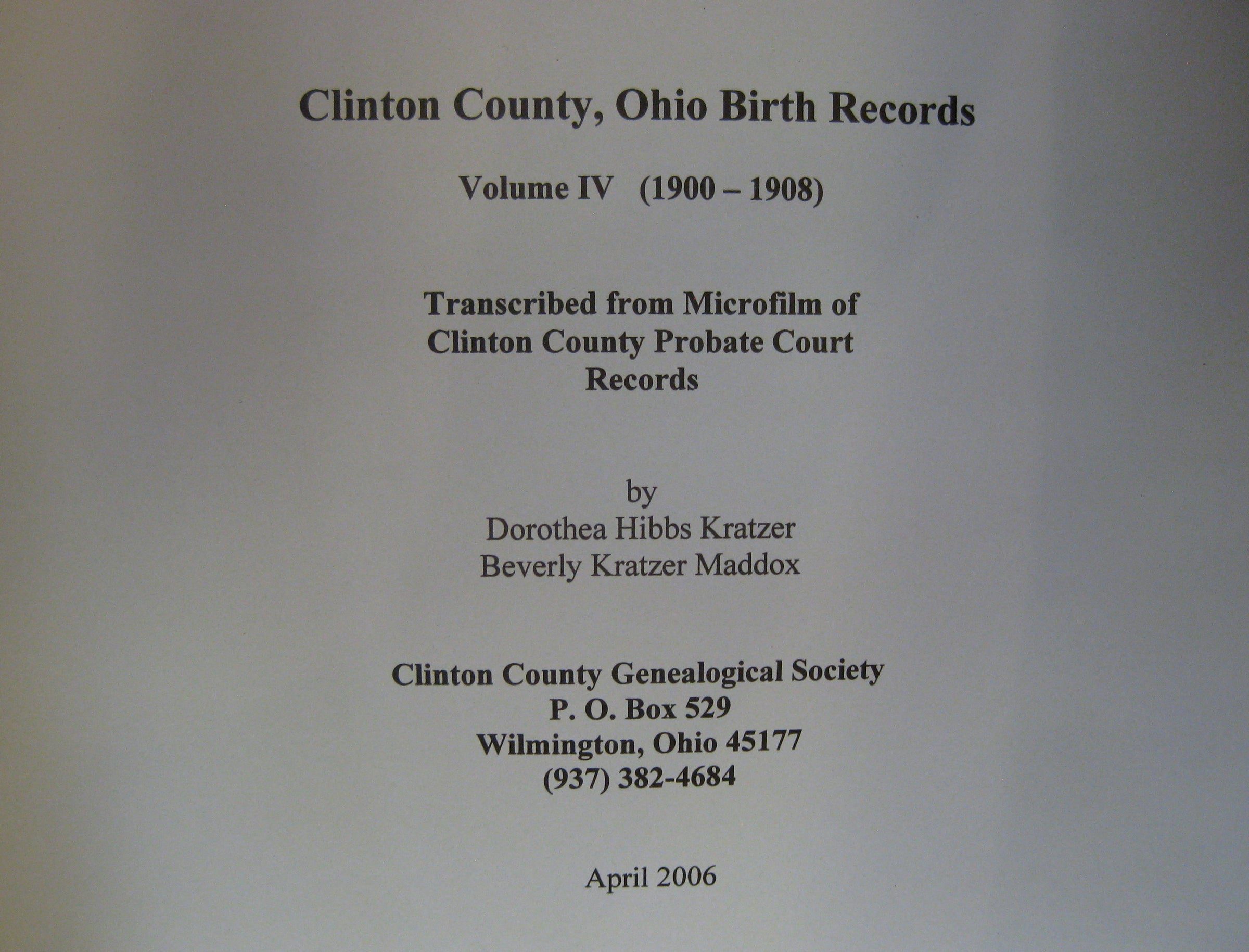 Book: Birth Records Vol IV, Clinton Co., OH – 1900-1908